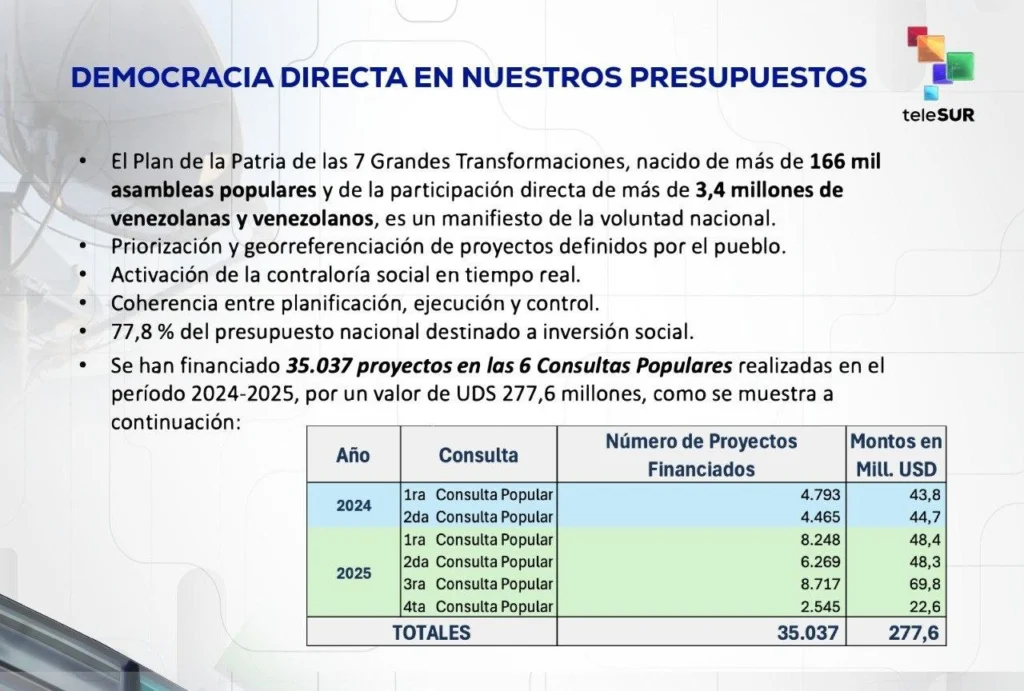 One of the central themes of the speech was direct democracy . Rodríguez reported that, through six Popular Consultations held between 2024 and 2025, 35,037 projects were funded for a total of $277.6 million , implemented directly by communes and community councils. These resources represent 77.8% of the national budget allocated to social investment .