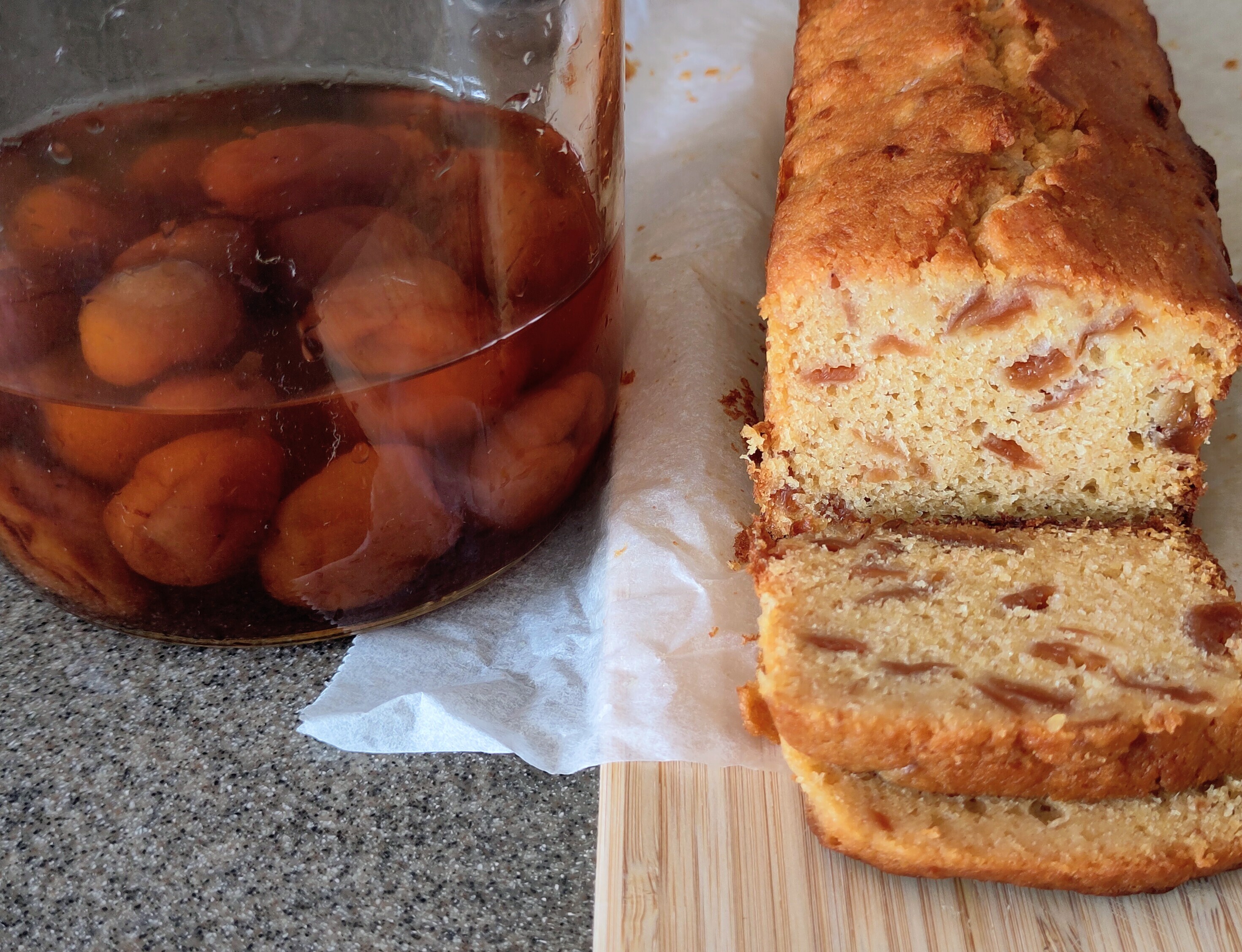 Il a l’air bien moelleux ce gâteau. Si je comprends bien, les morceau de trucs qu’on voit dans la pâte, c’est les prunes ? On sent beaucoup le goût de l’alcool ou ça passe à la cuisson ?